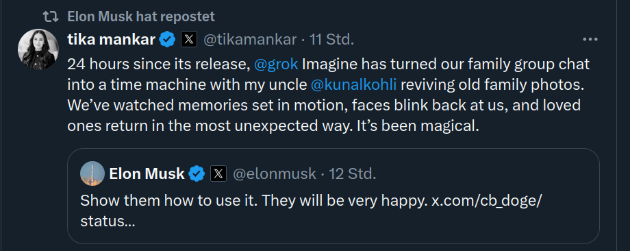 In meiner Zeitleiste bei X gibt es derzeit den Trend, aus Bildern durch KI Videoschnipseln zu erzeugen.